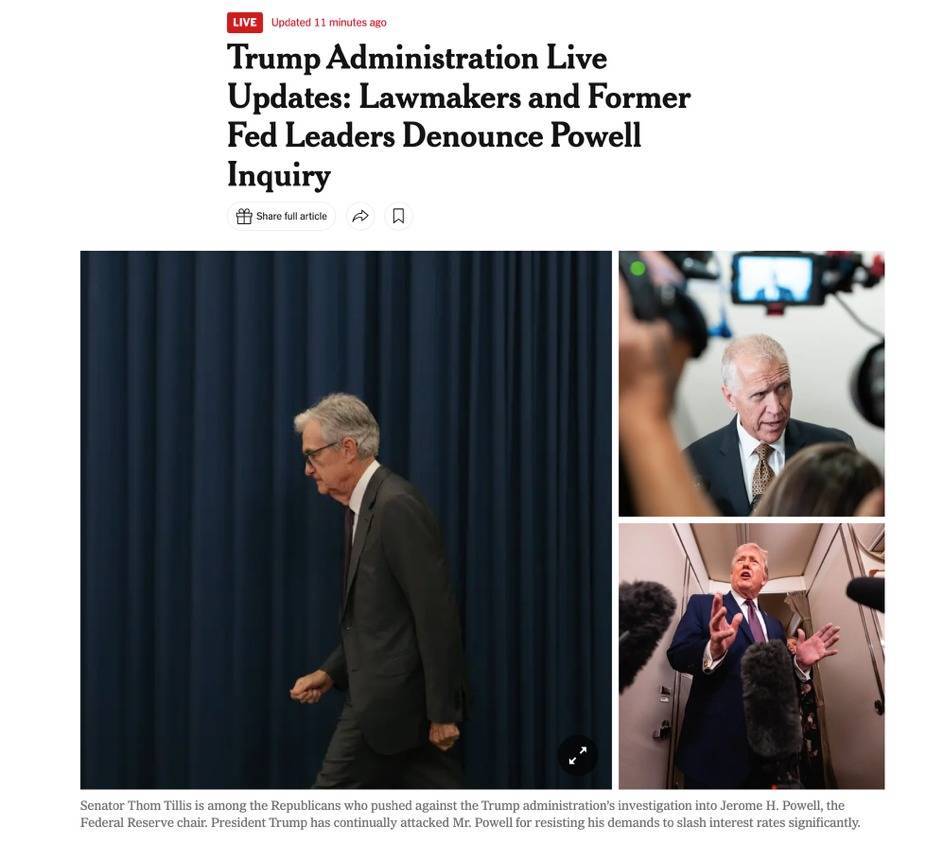 △《纽约时报》报道,议员和联储前领导人纷纷谴责对鲍威尔的调查