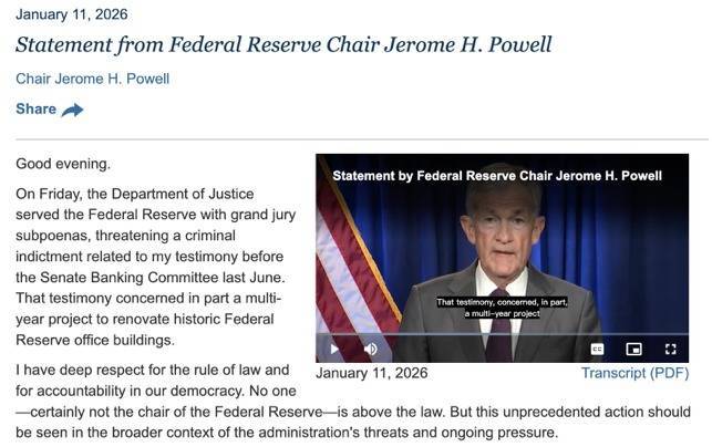 rrrr这场风暴名义上的起点,是美联储华盛顿总部历史建筑翻修项目及其预算与配置争议。日前,司法部围绕联储总部翻修项目与其国会证词“是否存在不一致之处”展开调查,向美联储送达大陪审团传票,并引发外界对潜在刑事指控的联想。结果,鲍威尔1月11日夜罕见发布视频,公开反击,否认存在不当行为,指出相关指控“不过都是借口”,之所以对联储发出刑事指控威胁,主要就是因为美联储按专业判断设定利率,“而不是一味迎合总统意愿”。
