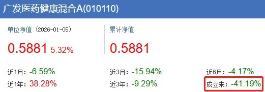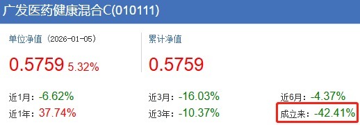 2025年三季报显示,广发医药健康混合前十大重仓股为科伦博泰生物、信达生物、荣昌生物、三生制药、百利天恒、荣昌生物、恒瑞医药、药明康德、泽璟制药、信立泰。该基金不仅在去年12月份业绩不佳,从2020年10月21日成立至今的5年多时间里,该基金A/C份额分别遭遇41.19%和42.41%的跌幅。