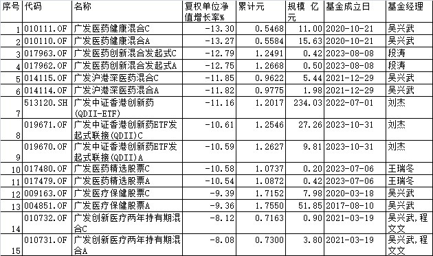 此外,吴兴武管理的广发沪港深医药混合C、广发沪港深医药混合A、广发医疗保健股票C、广发医疗保健股票A、广发创新医疗两年持有期混合C、广发创新医疗两年持有期混合A也都在12月里跌幅靠前。