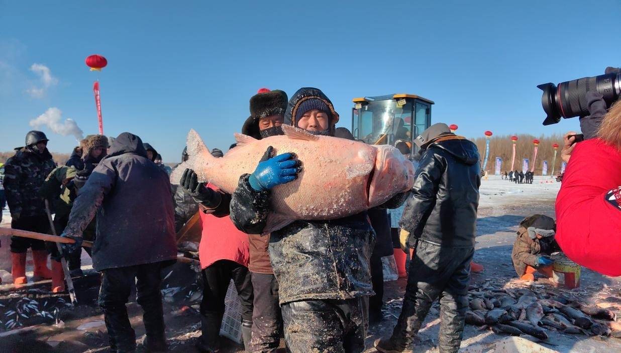 “冬捕+文旅”唤醒千年渔猎新活力。玉龙湖冬捕上演萨满舞蹈、祭湖醒网非遗仪式,渔民凿冰起网再现冬捕的壮观景象,现场实现捕捞、销售、邮寄一站式服务,形成了“捕捞观赏-现场采购-全国速递”的消费闭环。此外,现场设置的玉龙湖冬捕丰收惠民抽奖活动,市民参与其中并免费获得冬捕鲜鱼。