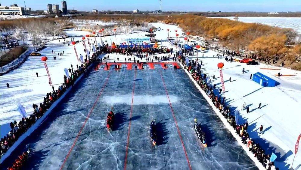 “第一次现场看冰上龙舟赛,选手们拼得热血沸腾,我们也看得心潮澎湃。周边的冰雪项目非常丰富,拍照有雪雕还有冰雕,拍照特别出圈。既有激情赛事,又有童趣体验。特别适合全家出游,玩累了,旁边还有取暖的帐篷,热饮都是免费的天金策略,服务特别到位。”游客张飞飞说。