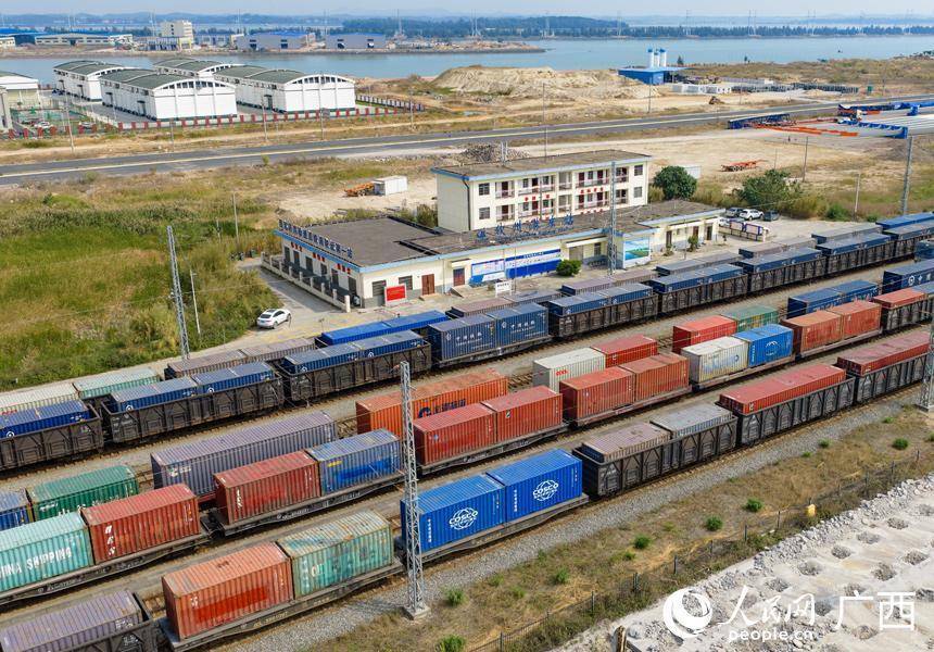 一趟满载集装箱货物的西部陆海新通道铁海联运班列,从钦州港东站缓缓驶出。陈磊摄